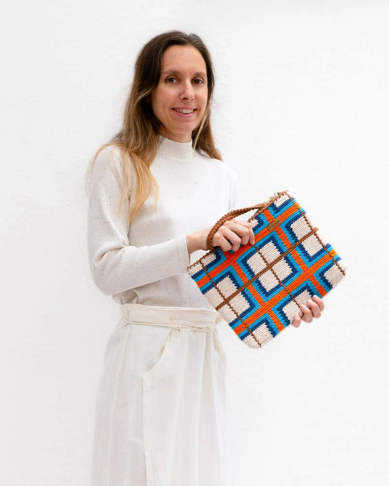 El bolso ERYN es un accesorio de crochet que desprende armonía y carácter. Inspirado en los paisajes y tejidos escoceses, combina la calidez del naranja con la serenidad del azul y la naturalidad del crema en un diseño de cuadros que transmite equilibrio y personalidad.