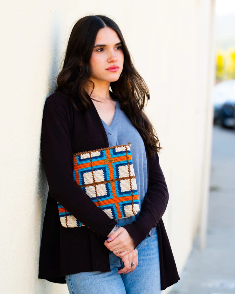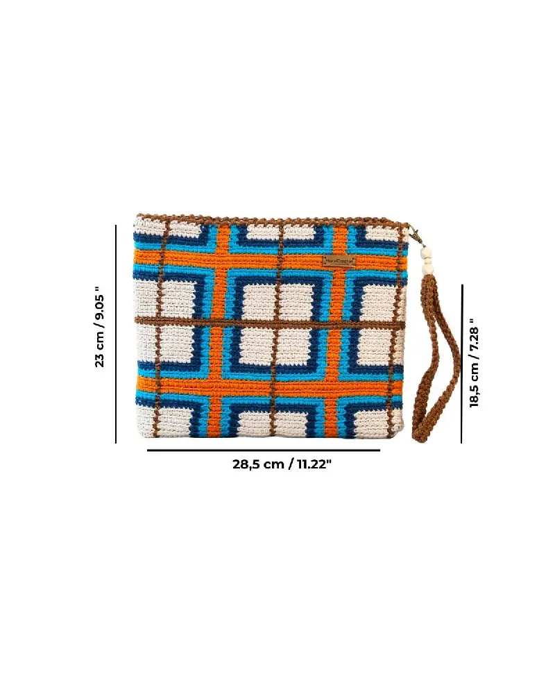 Bolso de mano tipo clutch tejido a crochet con diseño de cuadros en tonos azul, naranja, marrón y crema. Forrado con tela de algodón estampado, con cierre de cremallera y correa corta con cuentas de madera.