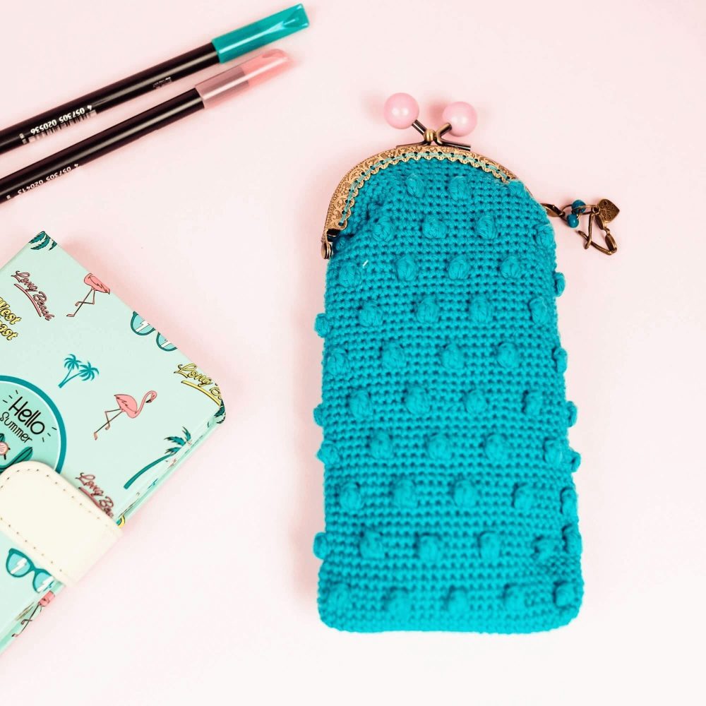 Funda de gafas de crochet PERLA hecha a mano, forrada y con cierre de boquilla vintage. Un diseño original y práctico para proteger tus gafas con estilo, disponible en verde, burdeos, lila y turquesa.
